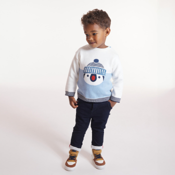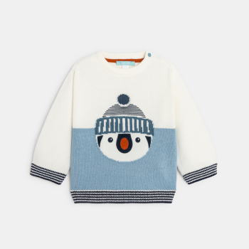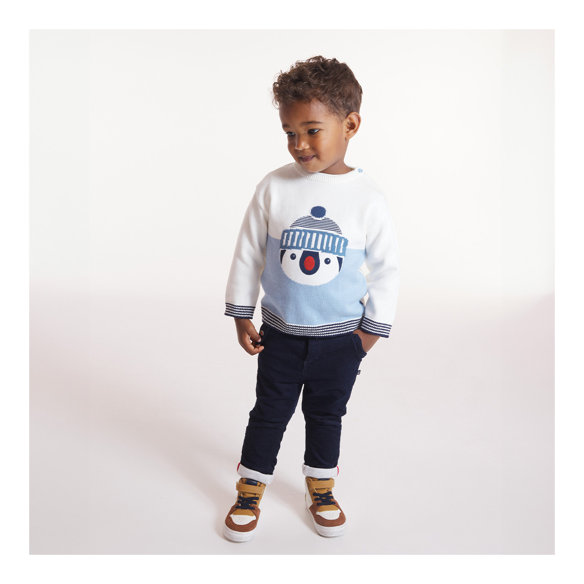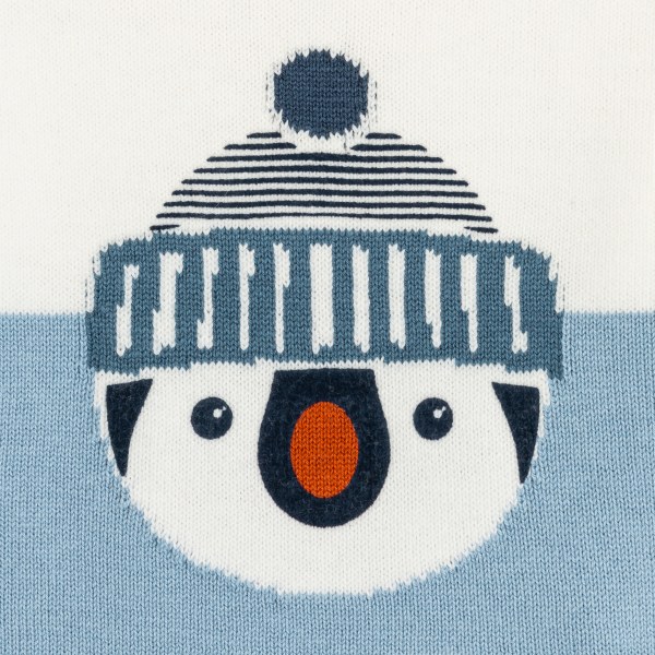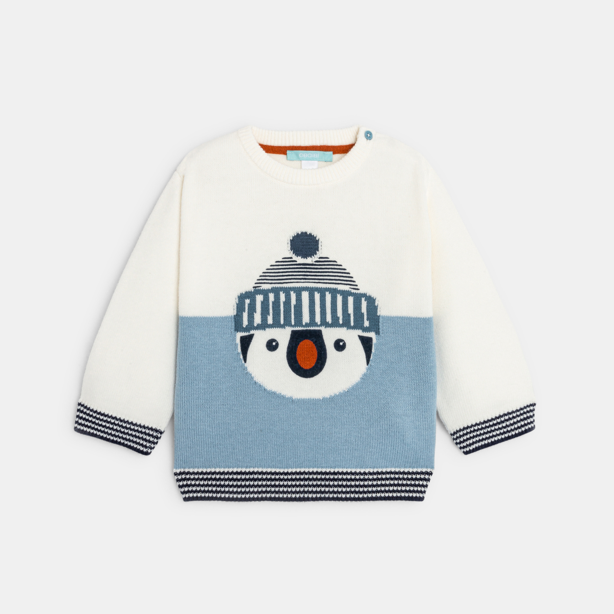 Description Bien au chaud sous son bonnet, le pingouin anime ce pull chaud et confortable. Les garçons apprécient sa maille tricot souple toute moelleuse. Illustration en jacquard et finitions rayées. Bouton épaule pour un passage de tête facile.