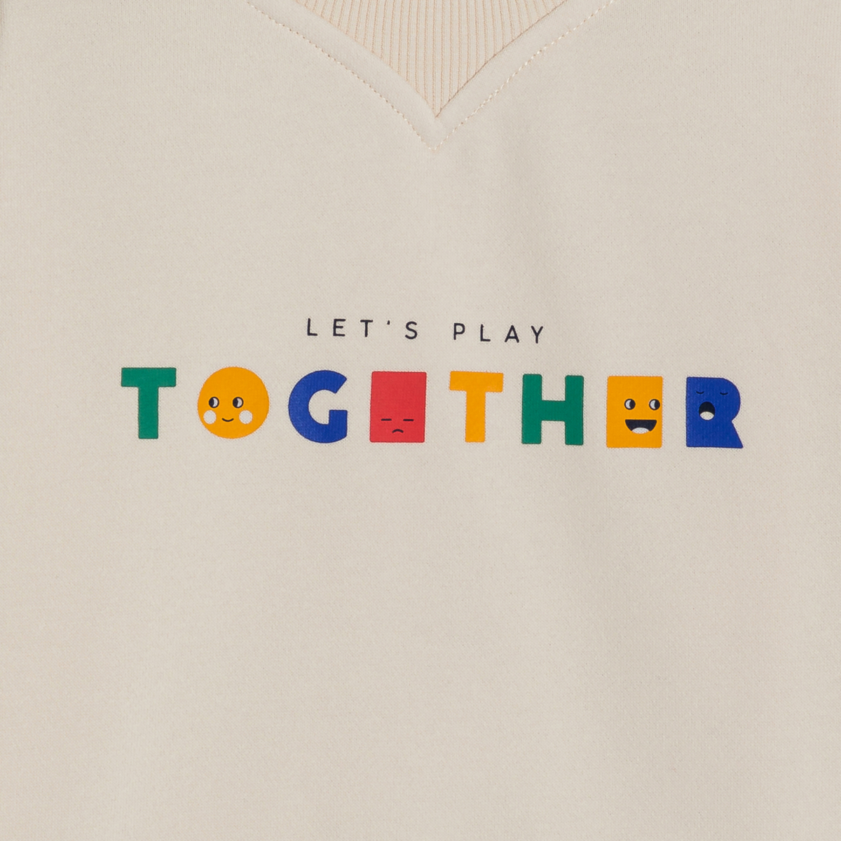 Description Impossible de résister à ce sweat-shirt garçon beige à manches longues colorées ! Confectionné en molleton doux, il arbore une coupe confortable avec col rond et message "Let's Play Together". Idéal pour le quotidien, il promet confort et style avec ses poignets et ourlet côtelés. Enfilage facile grâce à sa coupe ample.