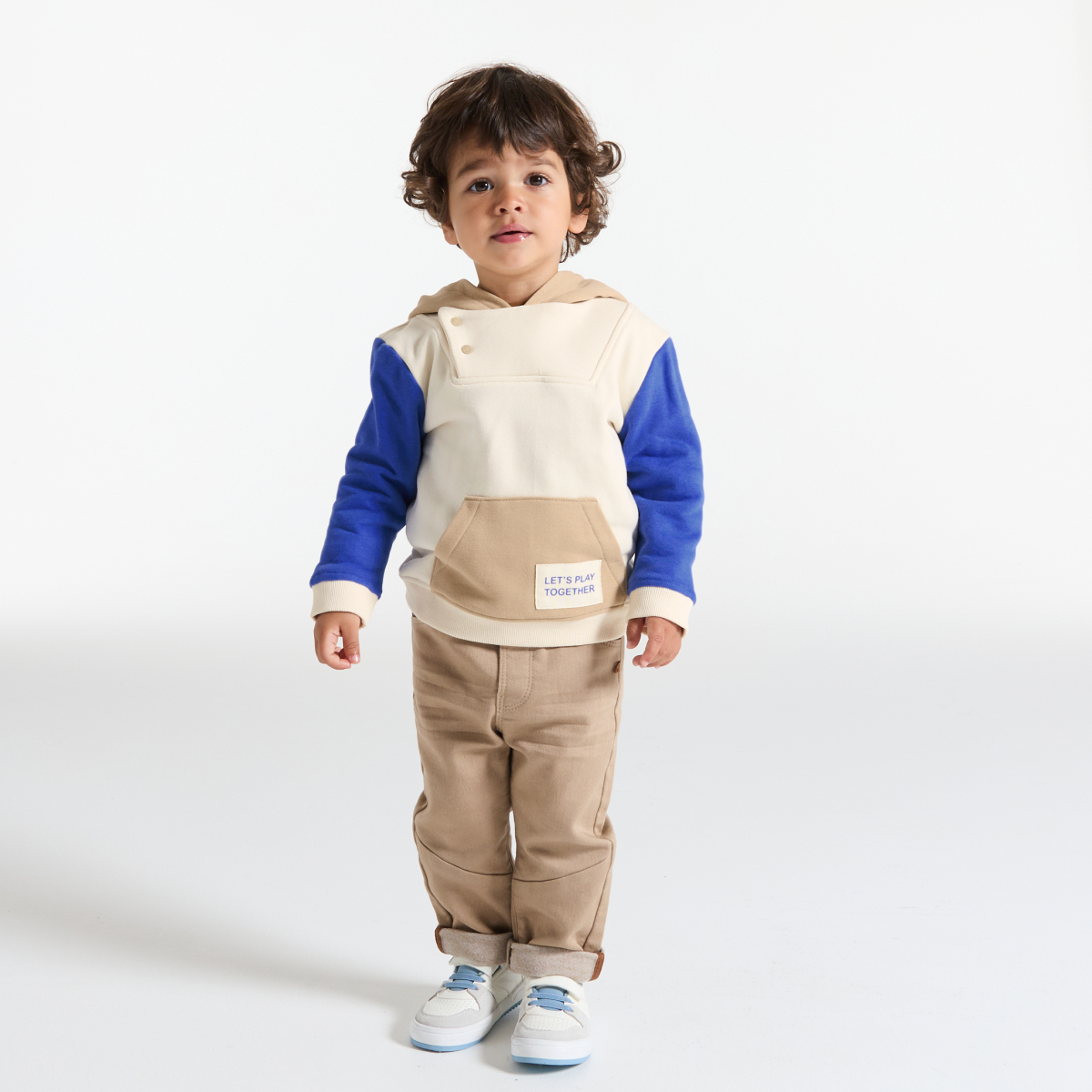 Moelleux et doux, ce sweat à capuche effet colorblock apporte une touche pétillante dans le vestiaire des garçons. Sa large capuche bien couvrante protège la tête des petits et sa fermeture par pressions sur le devant est originale.