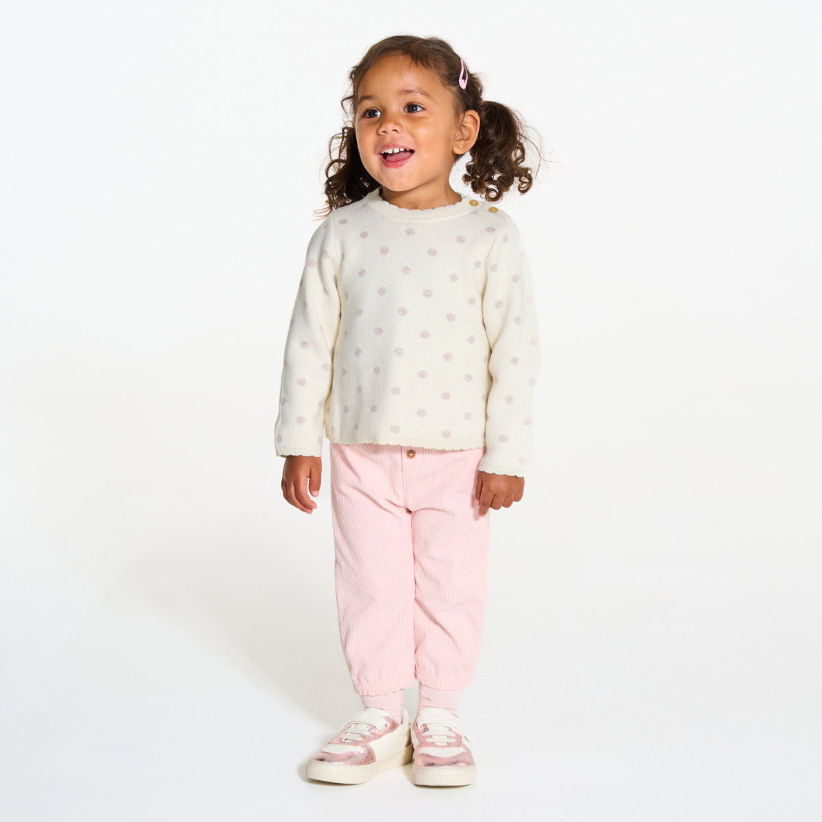 Un cocon de douceur et de chaleur pour ce pull en maille tricot moelleux sur la peau des petites. Base légèrement évasée tout confort et col festonné pour la touche originale. Pour un habillage facile, deux boutons épaule.