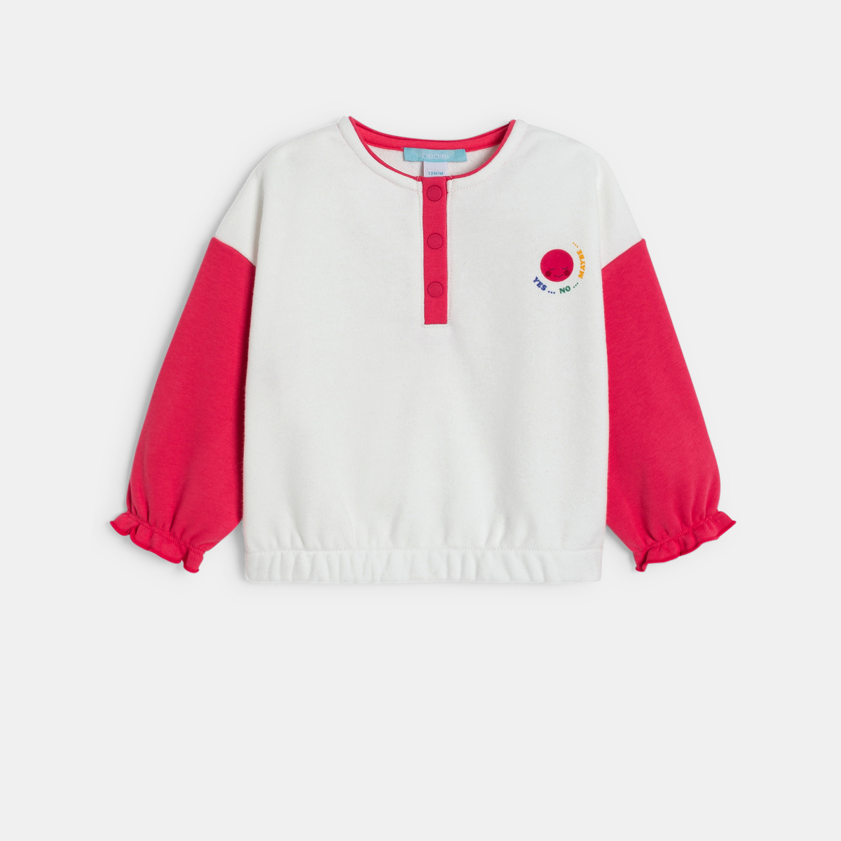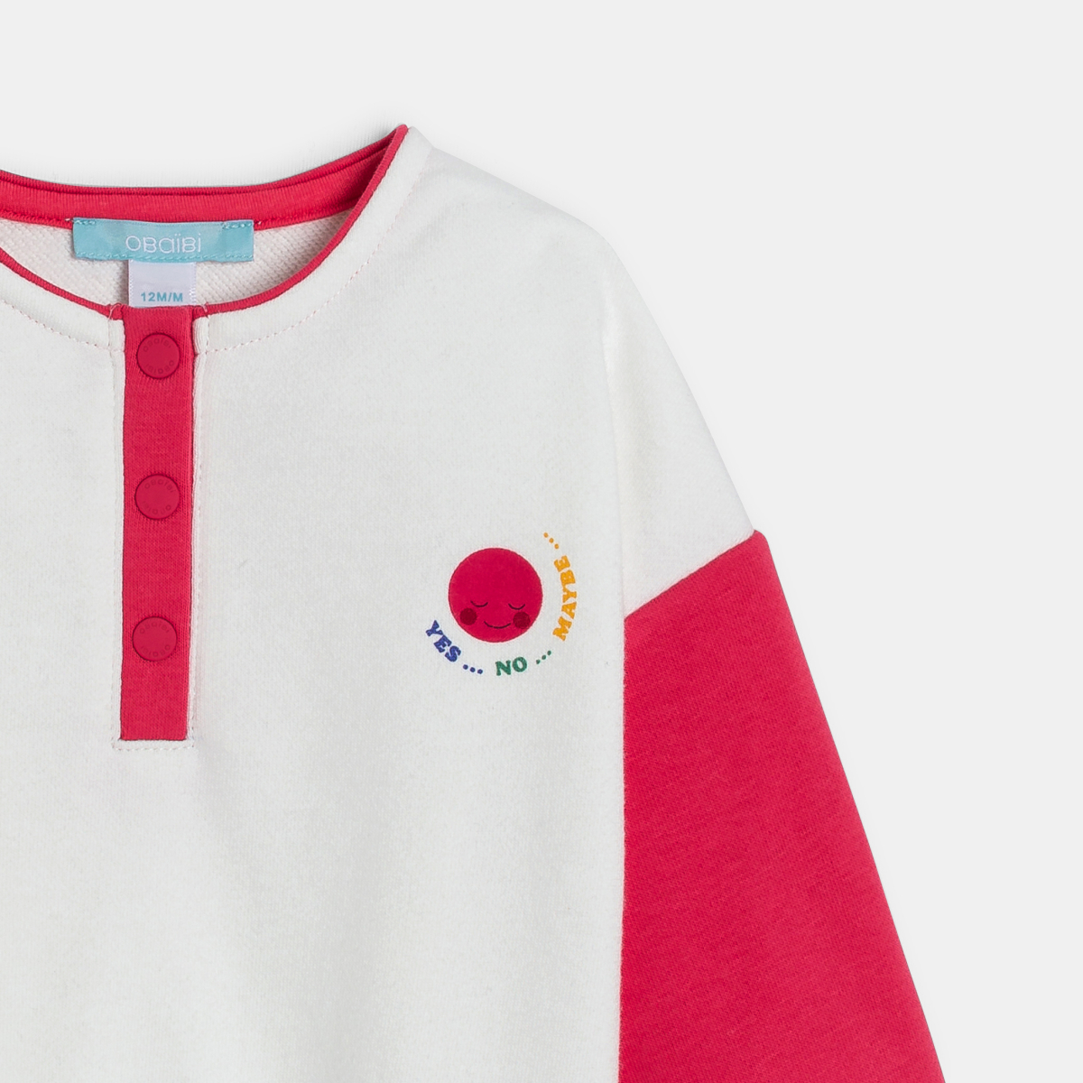 Sweat-shirt bicolore, coupe ample, en jersey doux. Manches longues contrastées avec poignets élastiqués pour un confort optimal. Demi-patte boutonnée pour un enfilage facile. Décoré d'un motif ludique sur la poitrine. Idéal pour un usage quotidien, alliant style et praticité.