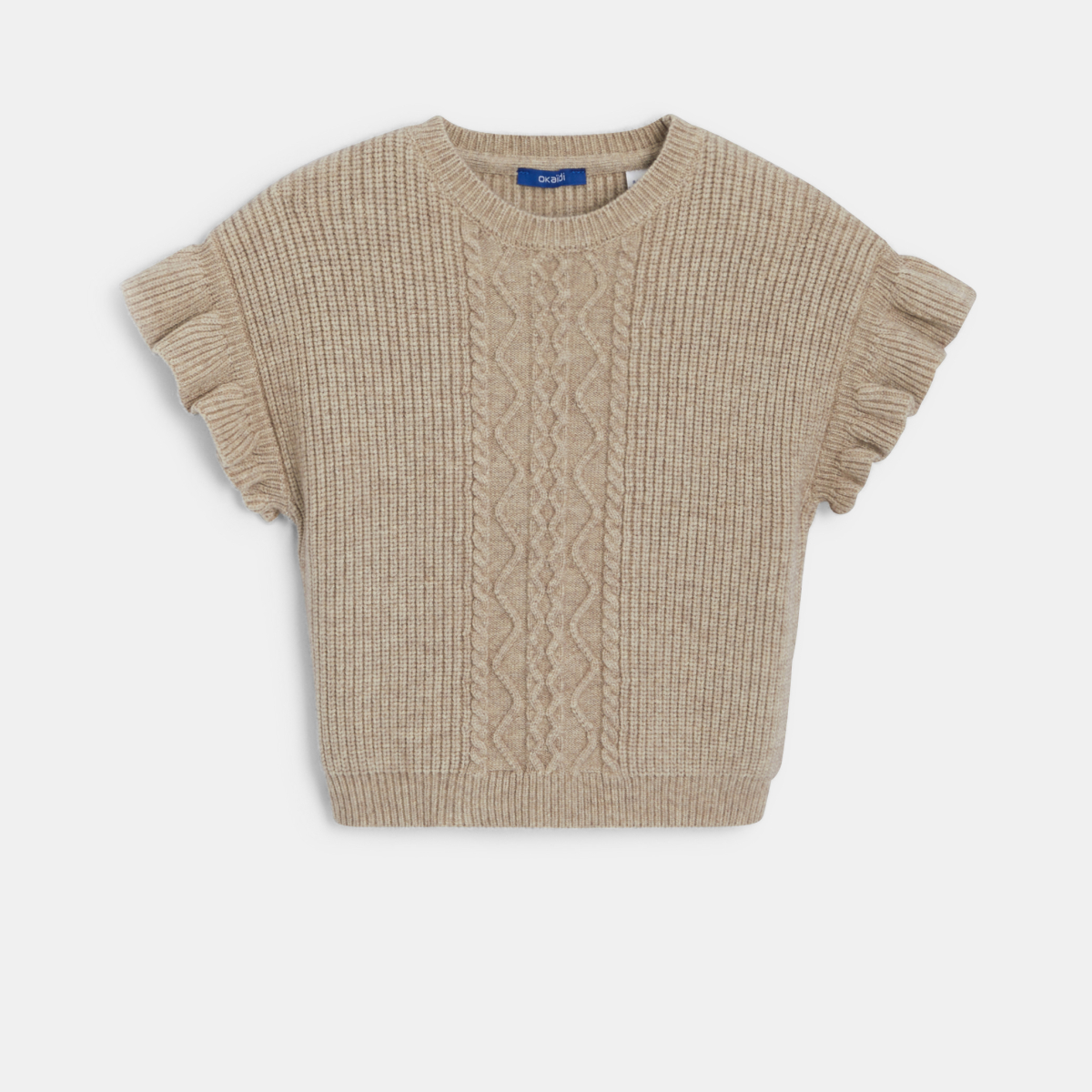Description Après un point météo, les filles portent ce pull bras nus, ou en duo avec une chemise ou un t-shirt manches longues. Focus sur les bords volantés "papillon" sur les manches courtes. Maille douce. Jeux de points torsadés et côtelés. Coupe légèrement resserrée à la base. Col rond. Base droite. Bords-côtes.