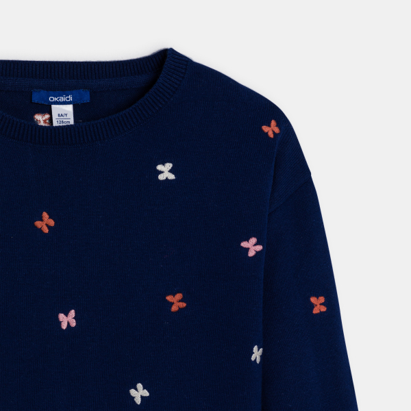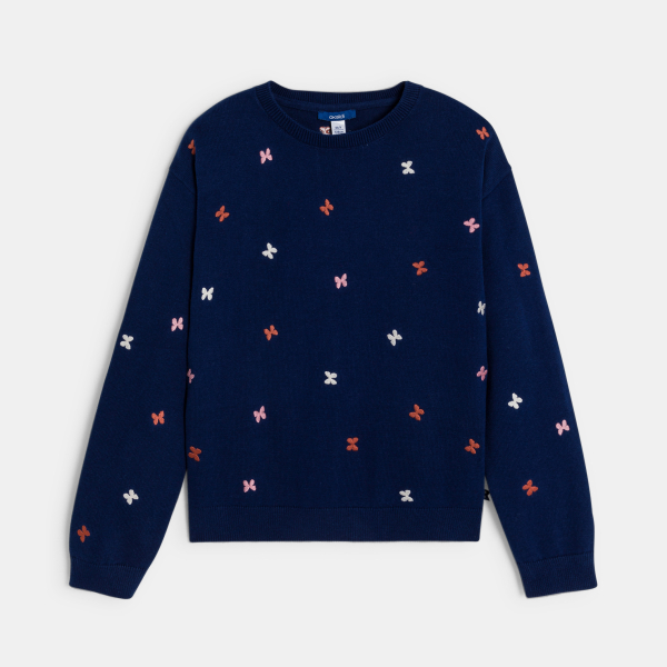 Description Ce pull bleu fille présente une coupe regular agrémentée de motifs papillon colorés. Confectionné en jersey doux, il dispose d’un col rond et de manches longues pour un confort optimal. Parfait pour un usage quotidien, il offre chaleur et style. Enfilage facile grâce à sa matière fluide.