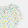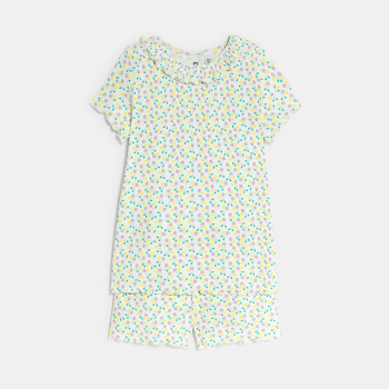Petites fleurs pastel et bords volantés... la coquetterie s'invite dans la nuit aussi ! Pyjama court composé de deux pièces : un haut (t-shirt coupe droite manches courtes col rond volanté) et un bas (short à taille élastiquée ruban à nouer). Jersey côtelé doux et extensible.