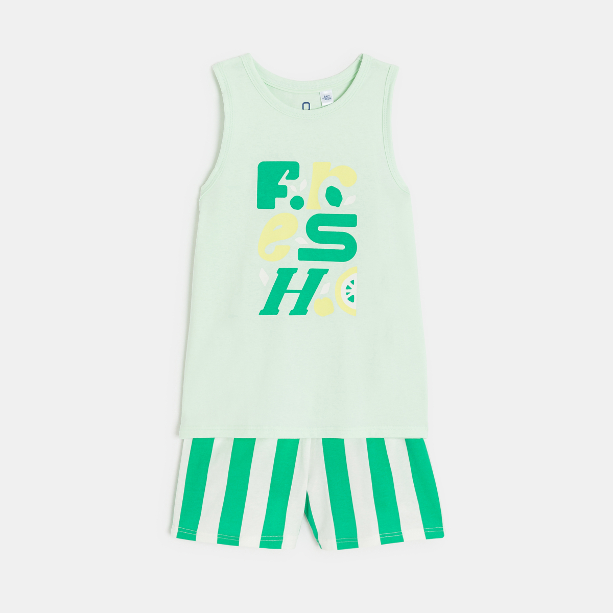 Description Tonique et léger : ce pyjama en jersey aime les nuits d'été, les matins qui chantent et les garçons prêts à profiter de la belle saison ! Ce pyjama est composé de deux pièces coordonnées : un t-shirt sans manches avec motif placé devant (coupe droite, col rond, dos uni) et un short rayé (taille élastiquée).