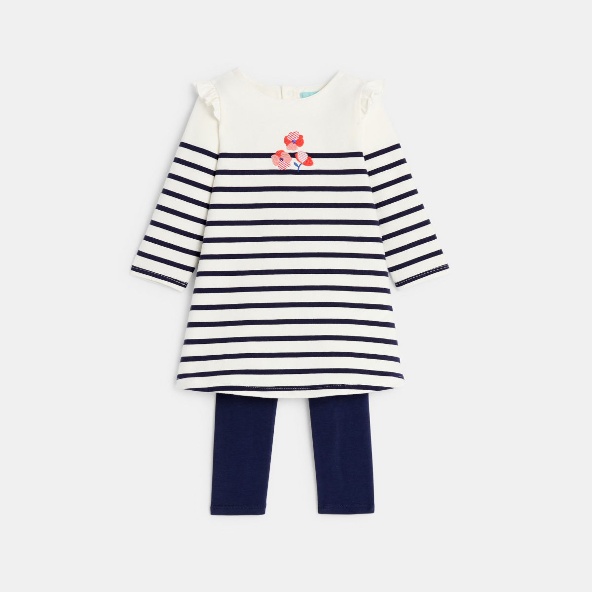 La marinière se revisite avec cette robe évasée qui plaît aux petites. En molleton doux et chaud ses épaules volantées et sa broderie florale ajoutent une touche de modernité. Pressions dos pour un habillage facile. Pour réchauffer les jambes des filles le legging bleu assorti crée l'ensemble.