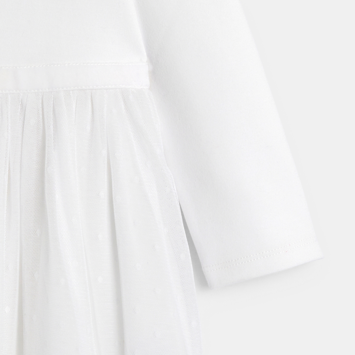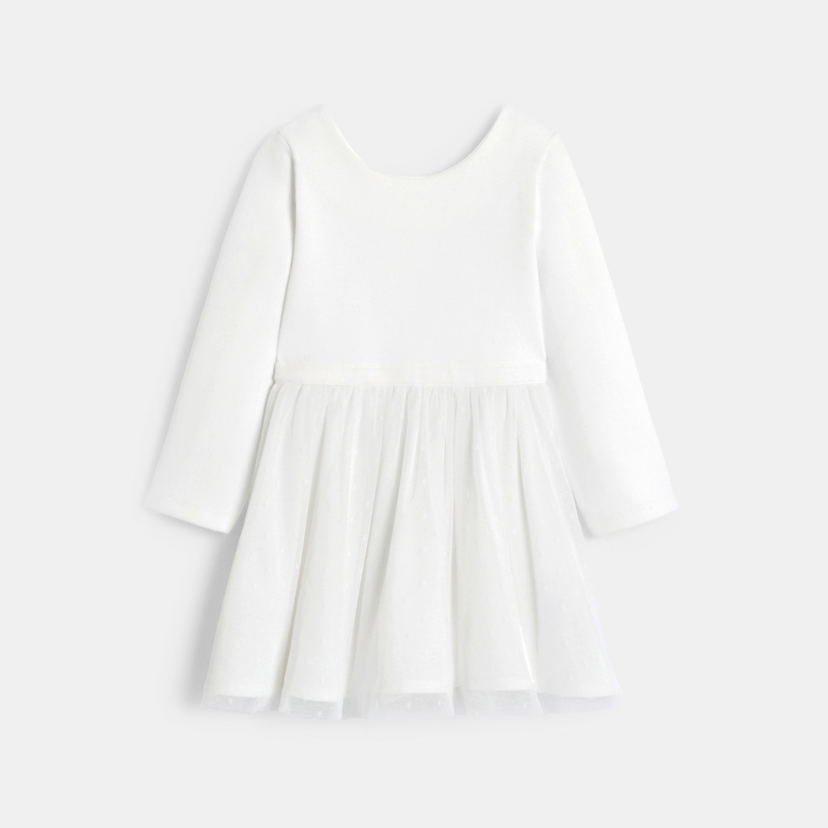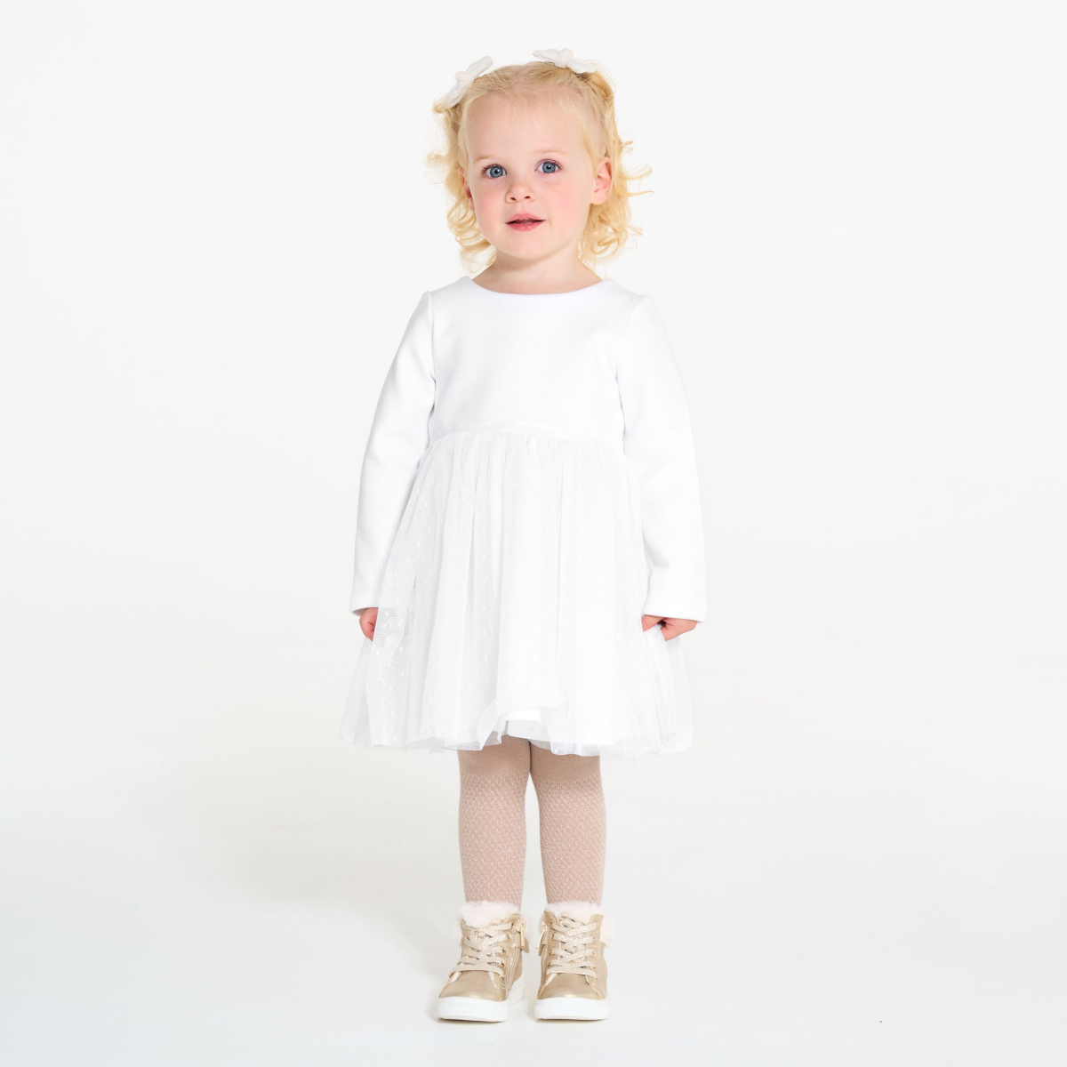 Pour célébrer un évènement important, cette robe est la tenue de fête idéale pour les filles. Un effet 2 en 1 avec haut en milano élégant et bas en résille plumetis pour un effet très vaporeux. Manches longues.