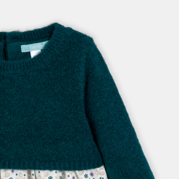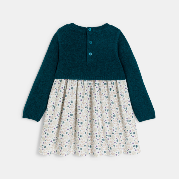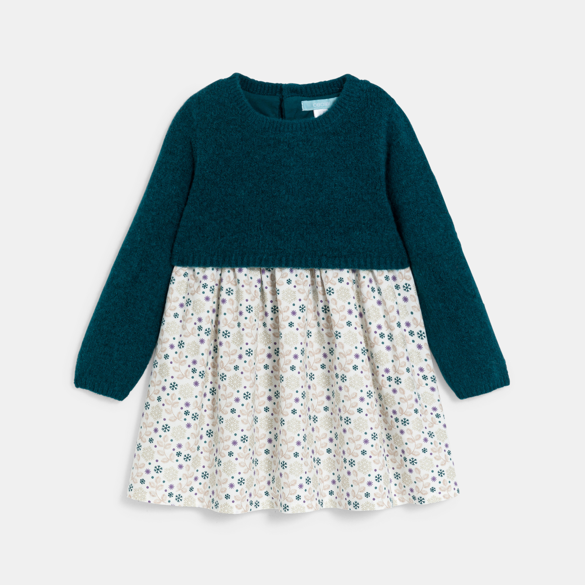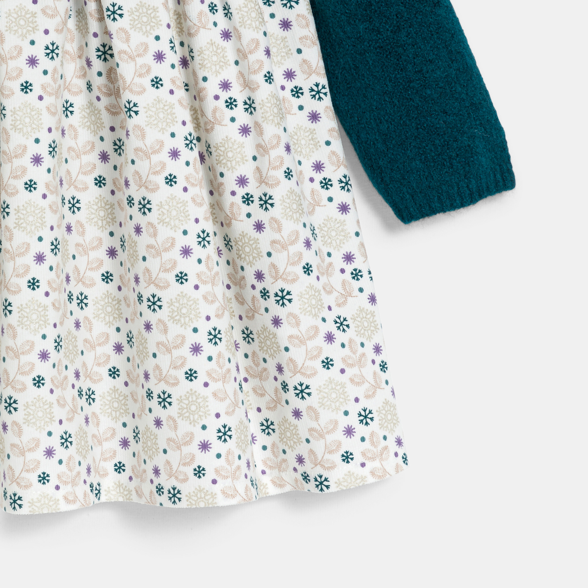 On adore l'effet deux en un de cette robe bi-matière originale. Haut manches longues en maille tricot douce et moelleuse et bas en coton fleuri. Fermeture dos pour habiller facilement les filles.