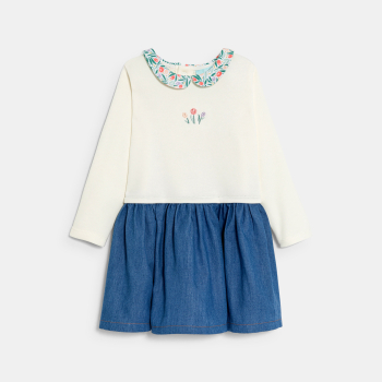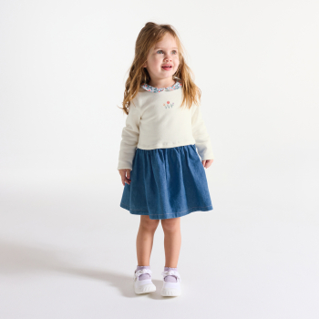 Avec son effet 2 en 1, cette robe a tout bon ! Idéale cette saison, elle réchauffe les filles avec son haut en molleton doux à col fleuri et sa jupe ample en coton denim. Fermeture par pressions dos pour habiller facilement les petites.