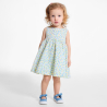 Pour les évènements et les beaux jours, une robe de cérémonie doublée légèrement gaufrée. Impression graphique fleurie et petites bretelles. Fermeture croisée dans le dos par boutons. Bloomer avec taille et cuisses élastiquées assorti. Bloomer inclus du 3 mois au 23 mois.