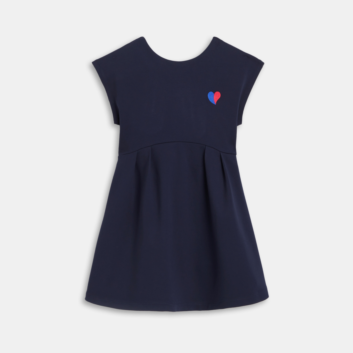 De la simplicité dans l'allure. Et un petit cœur brodé bicolore sur la poitrine pour une note d'originalité. Les filles sont ravies à l'idée de porter cette robe évasée. Jersey Milano. Col rond. Manches très courtes. Plis en détail. Base légèrement arrondie. Coutures ton sur ton.