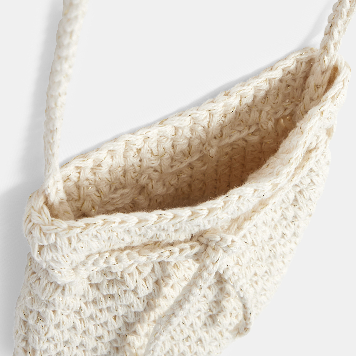 Comment emporter quelques effets personnels avec chic et originalité ? Réponse avec ce petit sac en crochet crochet. Il est légèrement pailleté pour se donner un air de fête ! Longue bandoulière tressée. Taille unique. Belle idée-cadeau.