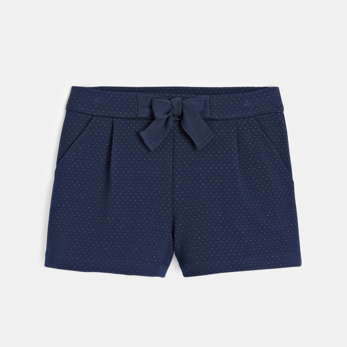 Des petits pois dorés illuminent discrètement ce short chic bleu marine ! En détail on remarque la présence de plis plats devant et d'un large ruban chevron à nouer. 2 poches. Ouverture par zip invisible côté. Tour de taille ajustable.