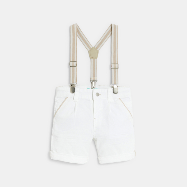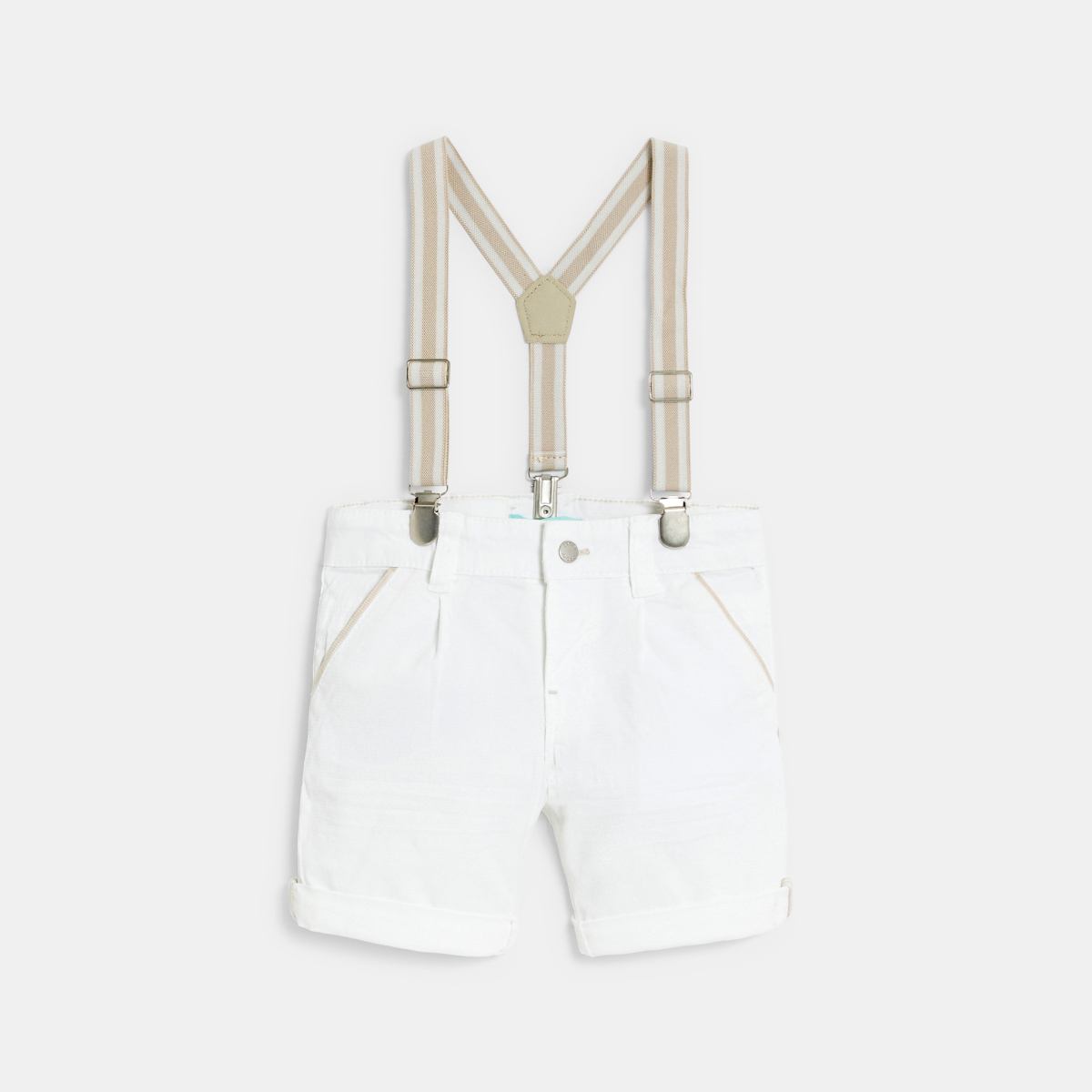 Bermuda à pinces en coton fantaisie et bretelles blanc bébé garçon