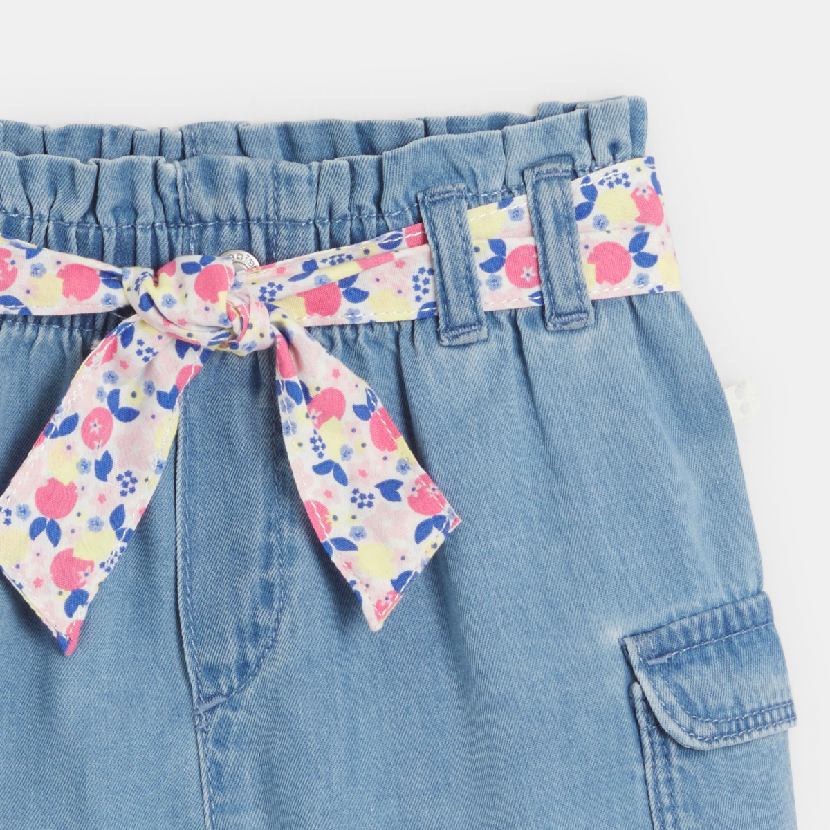 Short cargo denim léger à ceinture fleurie bleu bébé fille