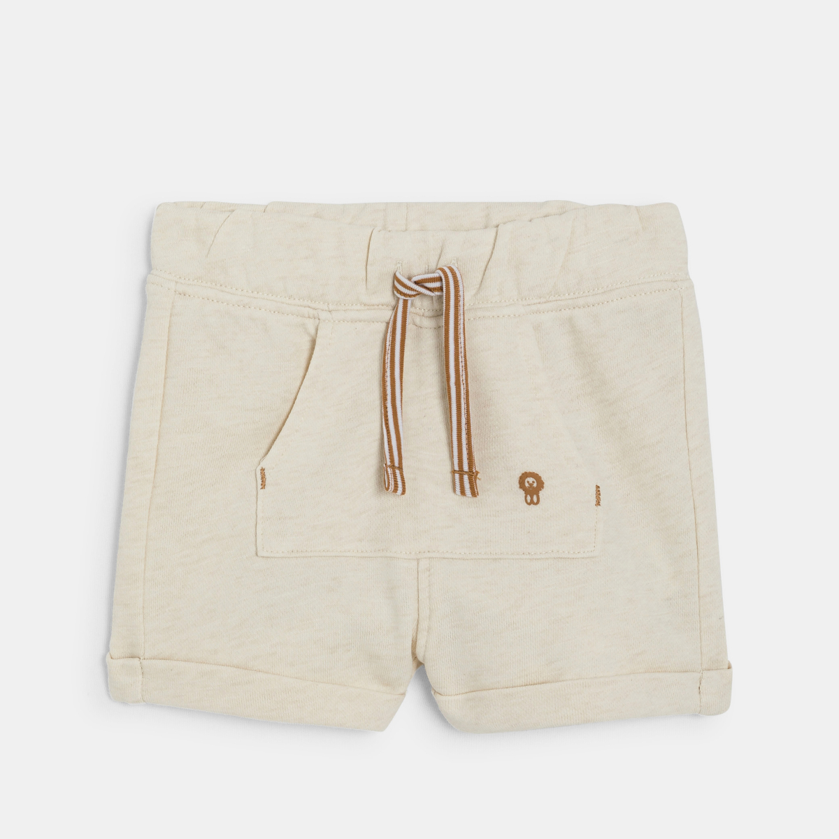 Tout confort un short sportswear essentiel dans le vestiaire des petits garçons. En molleton doux sur la peau. Poche unique ventrale et lien fantaisie. Taille boutonnée ajustable.