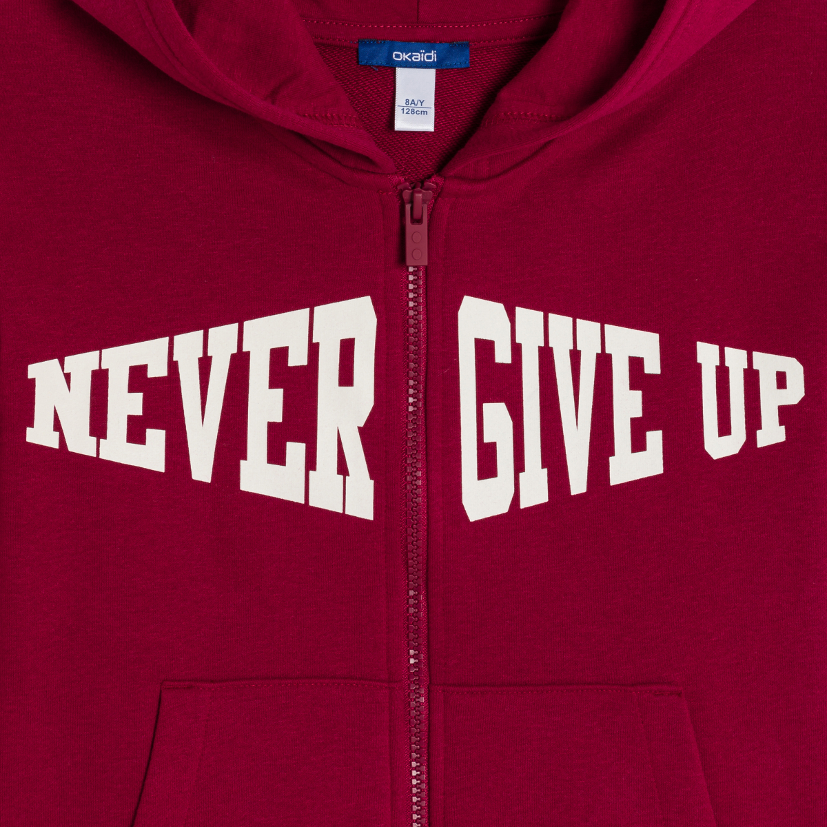 n"Never give up" ! Les garçons se motivent avec le message fort de ce sweat-shirt à capuche ! Molleton doux intérieur bouclettes. Capuche. Ouverture zippée devant. Manches longues. 2 poches façon kangourou. Base droite. Bords côtelés.n