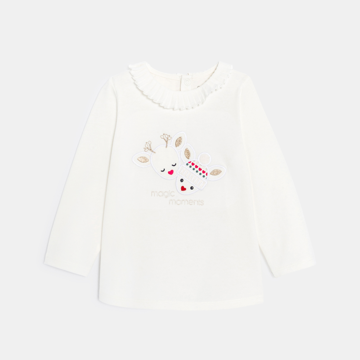 Douceur au rendez-vous avec ce tee-shirt brodé de rennes câlins. Manches longues et encolure volantée pour les filles qui aiment sa matière confortable. Broderies brillantes et pressions au dos pour un habillage facile.