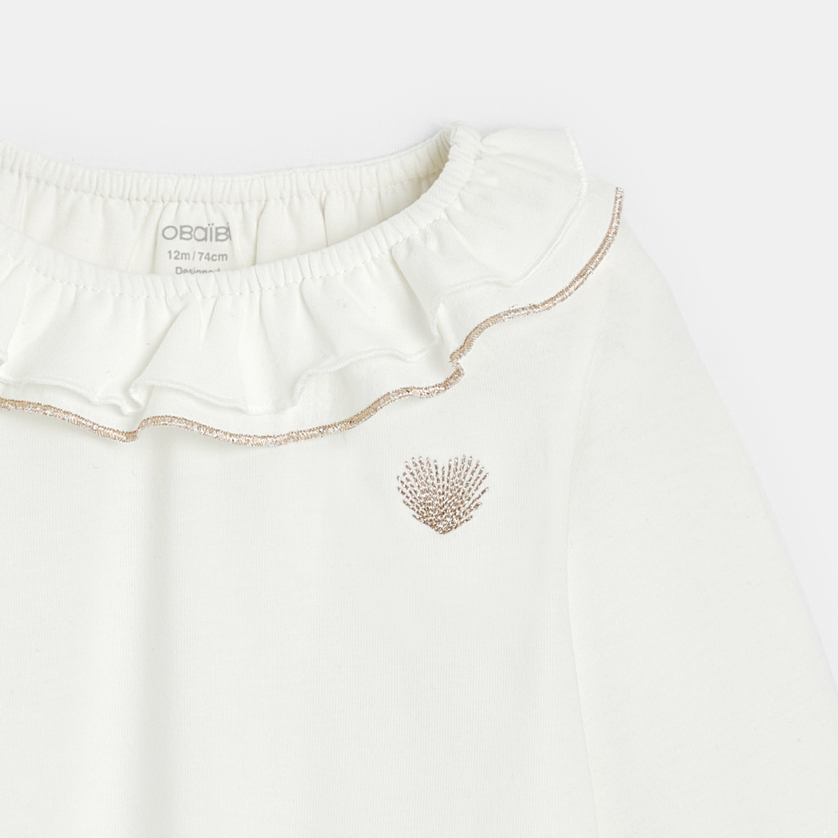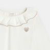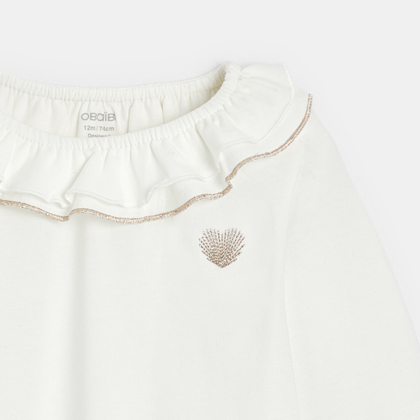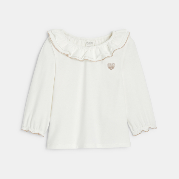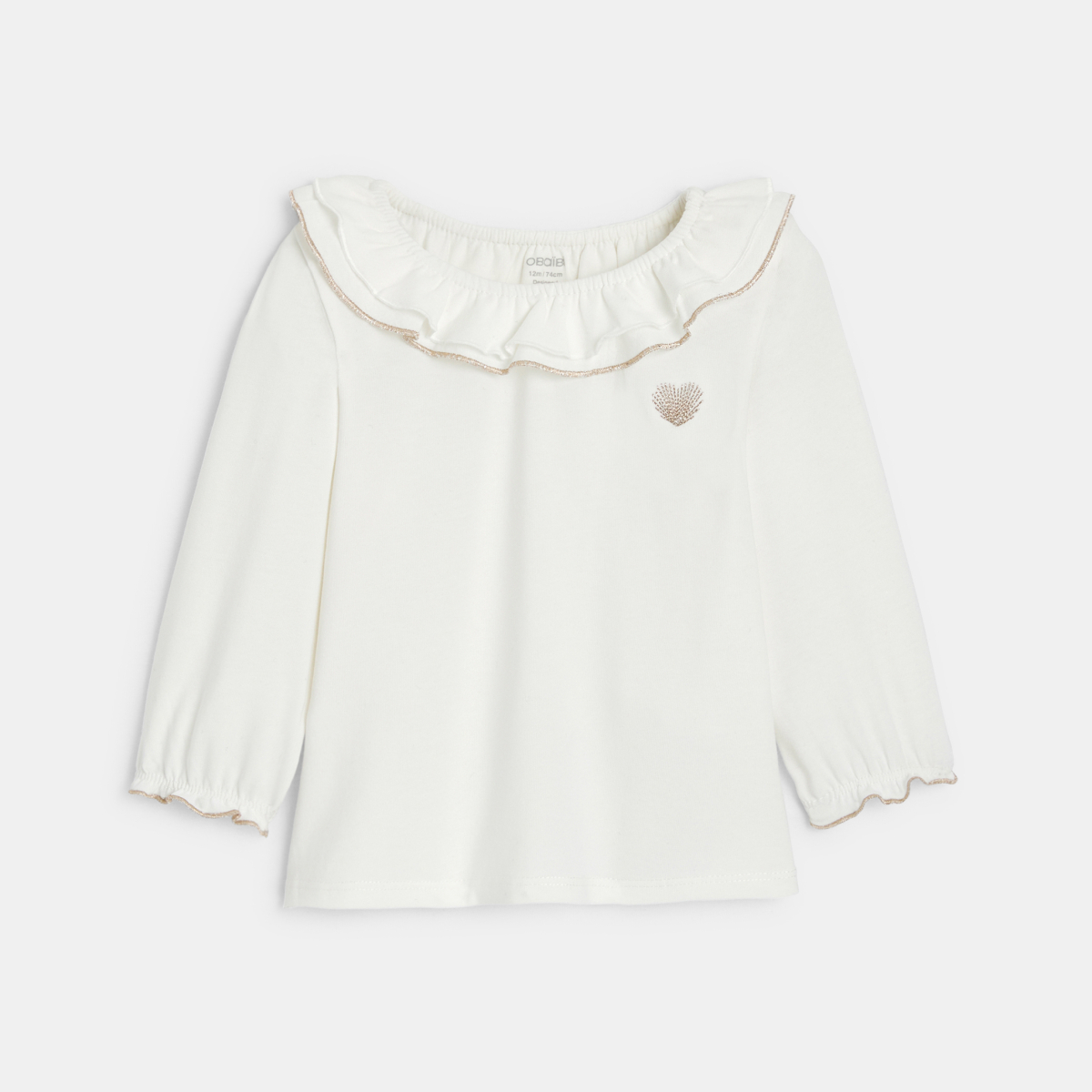 Pour les looks romantiques des petites un tee-shirt aux détails raffinés : un coton doux sur la peau un col pierrot fantaisie et un motif charmant. Manches longues élastiquées à surpiqûres contrastées.