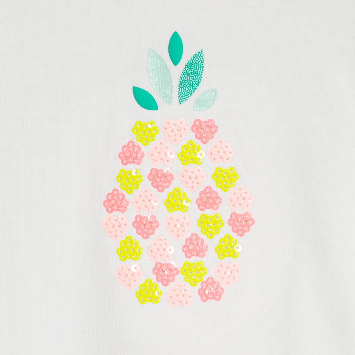 Description Les petites adorent l'effet graphique de cet ananas en sequins brillants ! Tee-shirt à la touche originale avec ses manches courtes élastiquées et froncées. Encolure ronde avec pressions dos pour un passage de tête facile.