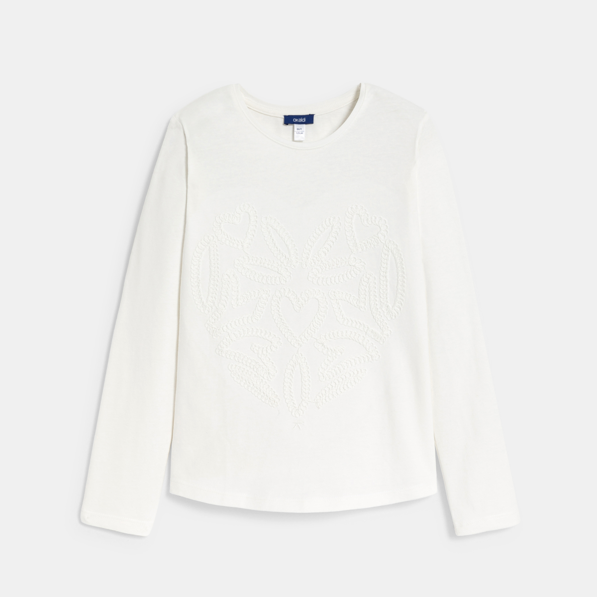 Sur ce t-shirt blanc, un motif brodé se dessine en ton sur ton devant : c'est beau et original ! A mixer avec un pantalon imprimé ou un jean tout simplement. Coupe droite. Col rond. Manches longues. Base légèrement arrondie. Coutures ton sur ton.