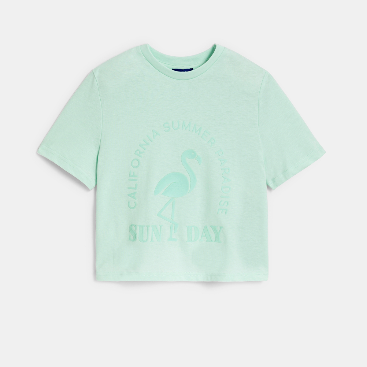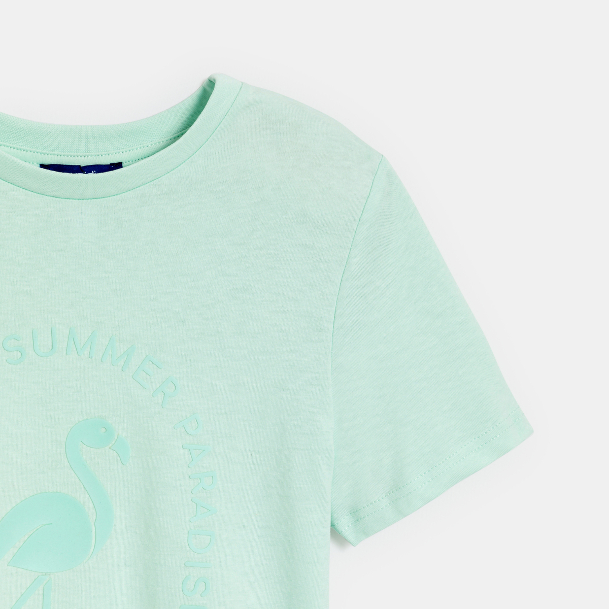Un flamant rose pour entrer dans lu2019été : c'est toujours une bonne idée ! Exemple choisi avec ce t-shirt vert pastel à manches courtes. Jersey doux. Coupe courte et droite. Col rond côtelé. Motif imprimé devant dos uni. Base droite. Coutures ton sur ton.