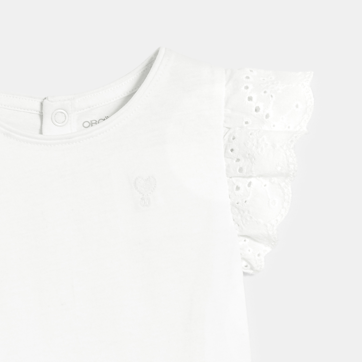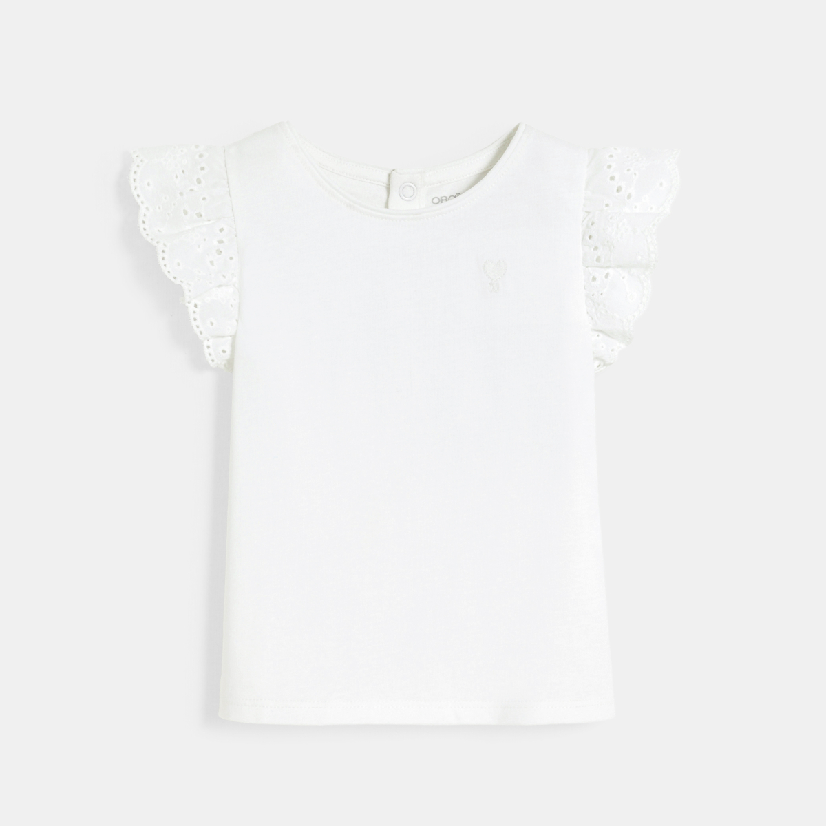 L'élégance subtile de la broderie anglaise habille les manches courtes de ce tee-shirt en jersey de coton. Pour un évènement ou un quotidien chic, les filles adorent ce petit côté rétro. Pressions dos pour un passage de tête facilité.