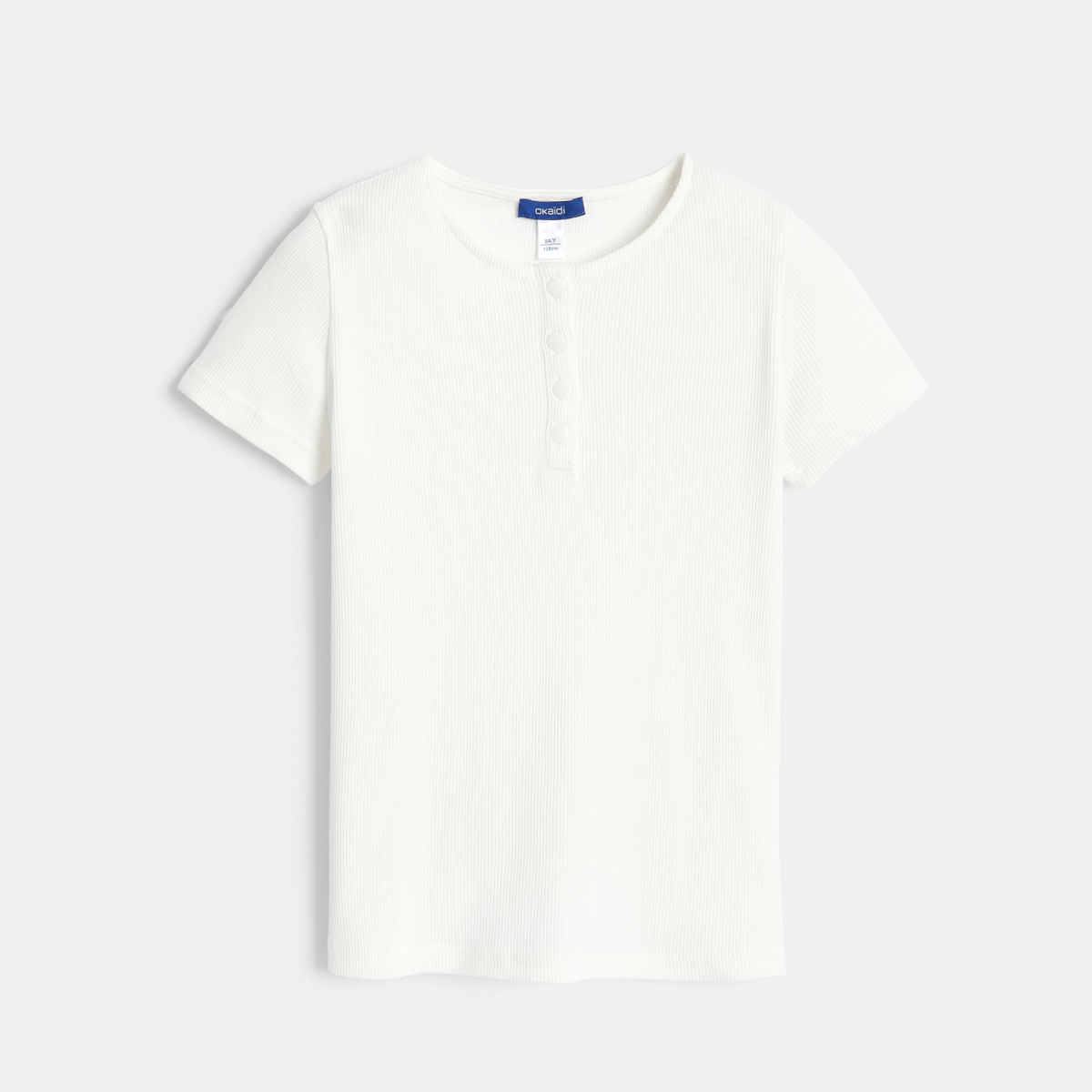 Bonne base dans un dressing. Ce t-shirt manches courtes est personnalisé d'une ouverture boutonnée sous son encolure arrondie. A porter en solo sous le soleil ou sous un gilet à la rentrée. Jersey côtelé. Coupe droite. Manches courtes. Base droite.