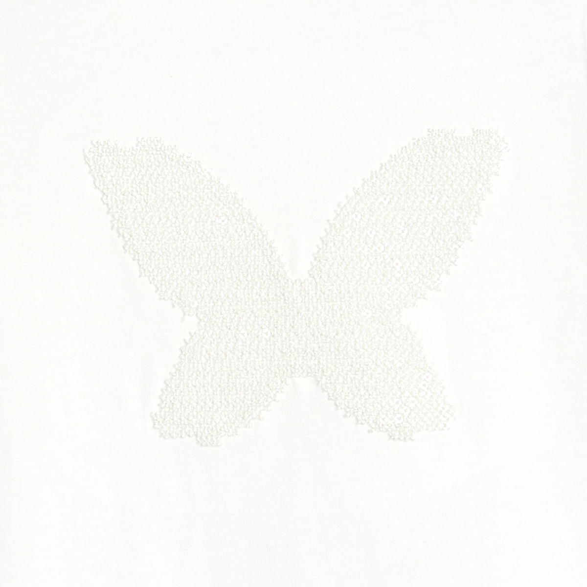 Un papillon en relief et des manches papillon… la légèreté domine cette saison ! Les filles choisissent ce t-shirt en jersey pour l’associer facilement avec une jupe, un short, un jean… Coupe droite. Encolure arrondie. Manches courtes. Base droite.