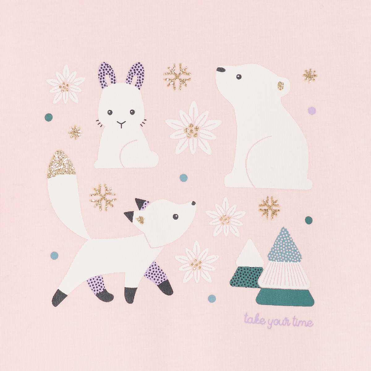 Bien emmitouflée dans son écharpe, les animaux de la forêt restent au chaud cet hiver ! Pour affronter les journées fraîches, ce tee-shirt manches longues avec col roulé style sous-pull protège les petites du vent et du froid. Pressions dos pour un passage de tête facile.