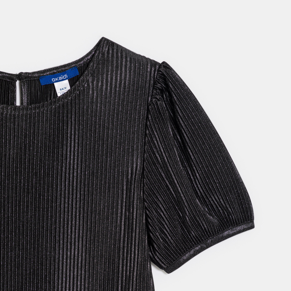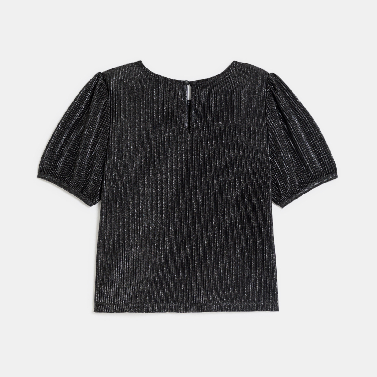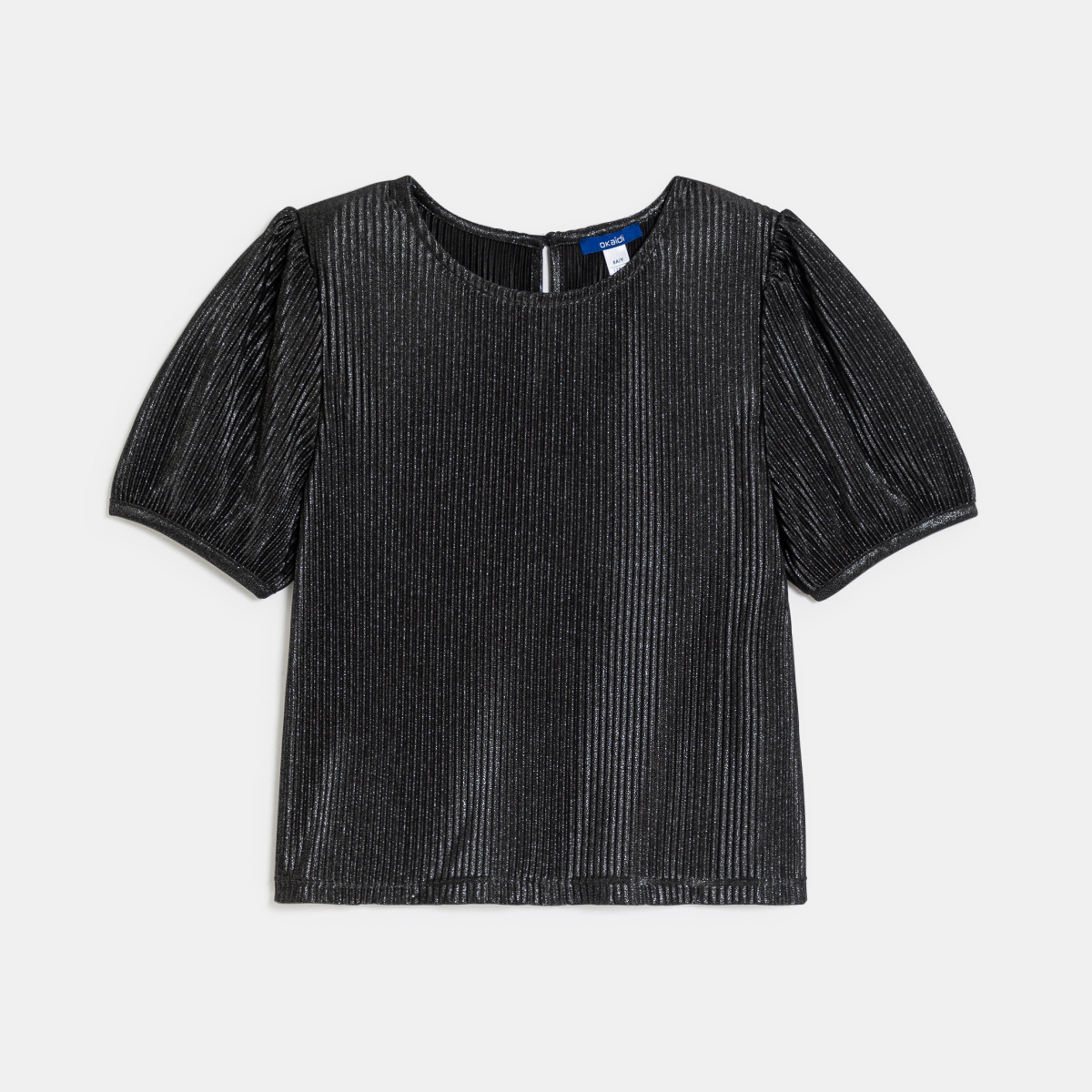 Il y a comme un air de fête dans l'air dès que les filles portent ce t-shirt manches courtes plissé et pailleté ! A mixer avec du noir du gris du blanc ou une couleur vive ! Plissé permanent (ne se repasse pas). Coupe droite. Col rond découpe boutonnée dans la nuque enfilage facile. Manches ballon. Base droite.