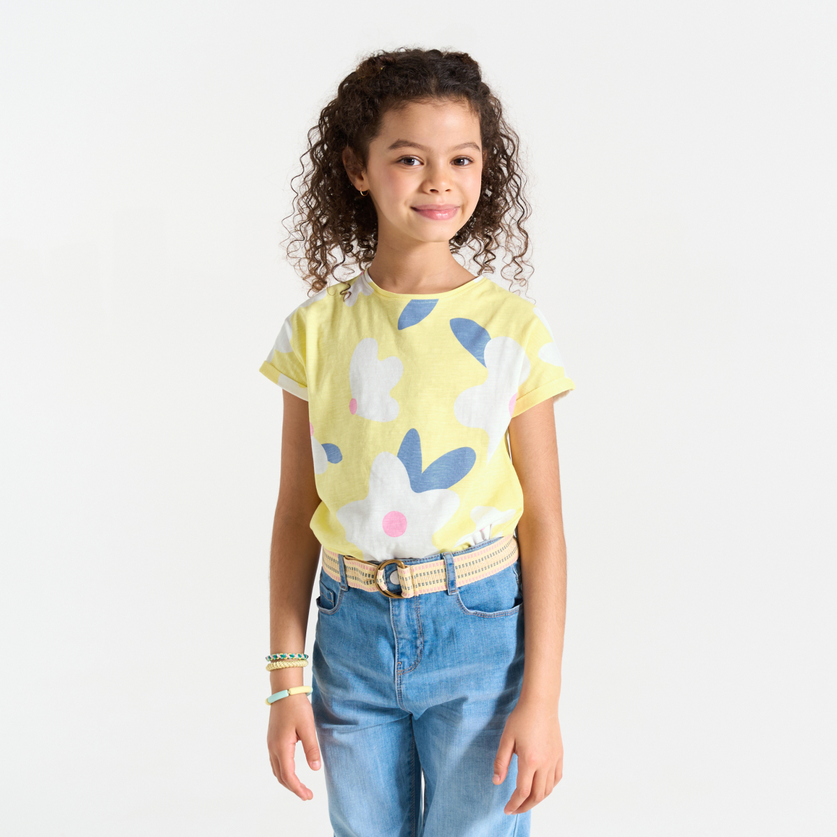 Description Avec ou sans soleil, on a toujours besoin de fleurs pour embellir ses journées ! Vite, les filles flashent sur ce t-shirt imprimé de grandes fleurs. Jersey doux et flammé. Coupe droite. Encolure arrondie. Manches courtes à revers piqués. Base arrondie. Coutures ton sur ton.