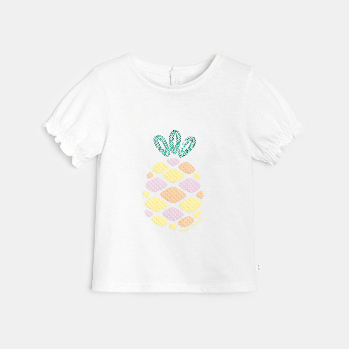 Description Les petites adorent l'effet graphique de cet ananas en sequins brillants ! Tee-shirt à la touche originale avec ses manches courtes élastiquées et froncées. Encolure ronde avec pressions dos pour un passage de tête facile.