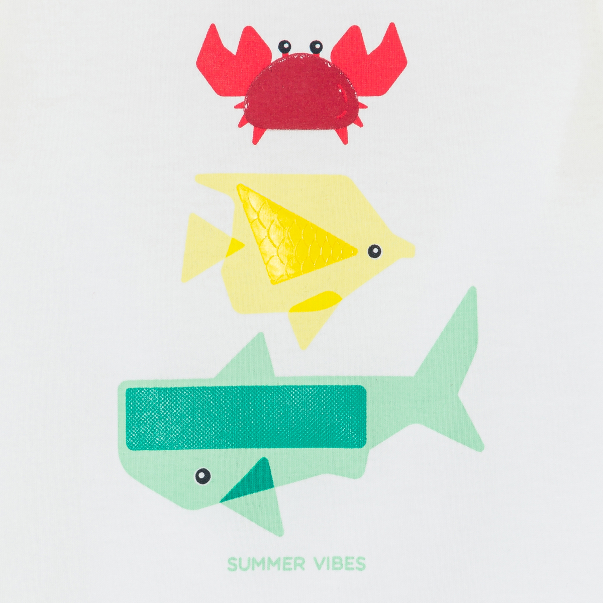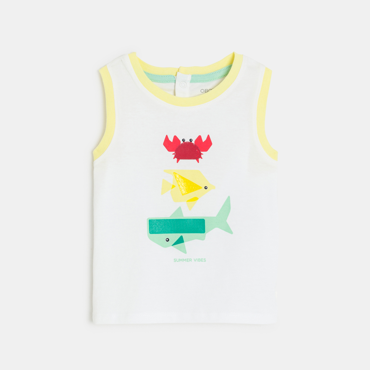 Pour éveiller les garçons et stimuler leur sens du toucher, ce débardeur met les animaux à l'honneur ! Zones en relief ou douce, avec un requin, un poisson et un crabe colorés. Un tee-shirt sans manches en coton doux indispensable quand il fait chaud. Pressions dos.