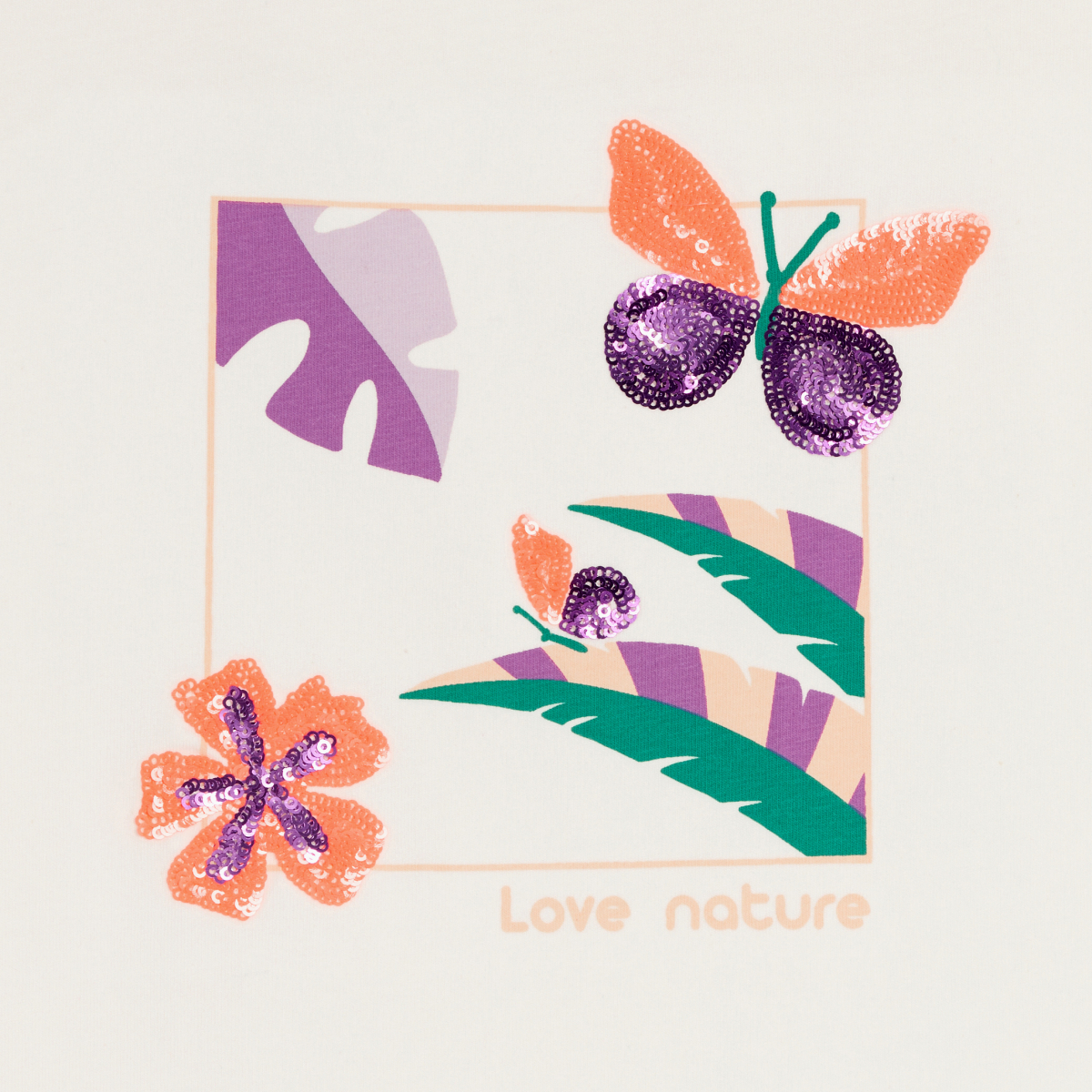 Sur ce t-shirt printemps-été, les motifs imprimés sont rehaussés de sequins brodés : les filles fans de nature adorent ! Jersey doux. Coupe droite. Encolure arrondie. Manches courtes à revers piqués. Base légèrement arrondie. Coutures ton sur ton.