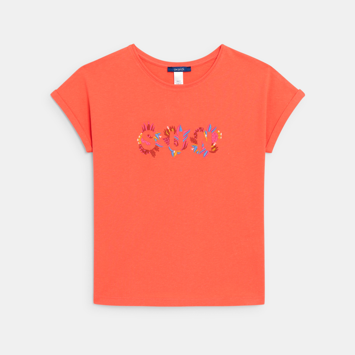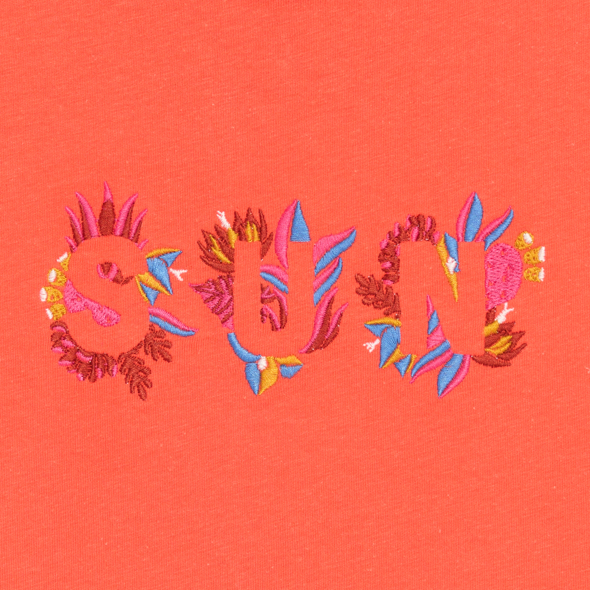 On zoome sur le message SUN brodé devant : magnifique, il personnalise ce t-shirt spécial beaux jours ! Jersey doux. Coupe droite. Col rond. Manches courtes. Dos uni. Base droite. Coutures ton sur ton.