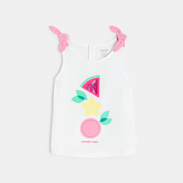 Vive les beaux jours ! Chapeau de soleil, lunettes et débardeur : les filles sont prêtes pour jouer à la plage ! Et pour y aller, elles portent leur débardeur préféré, avec les nœuds fantaisie aux épaules ! Pressions dos pour un habillage facile.