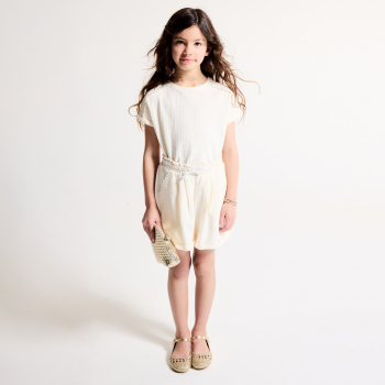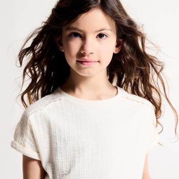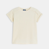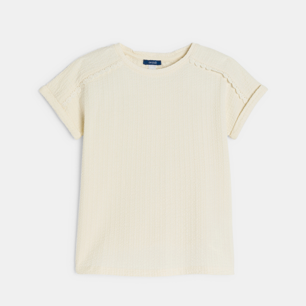 Description Cette saison, les filles en jersey ajoutent de la douceur à leur look avec ce t-shirt en jersey gaufré ! A noter : le biais au crochet en détail sur les épaules. Coupe droite. Col rond. Emmanchures descendues. Manches courtes à revers piqués. Base droite. Coutures ton sur ton.
