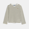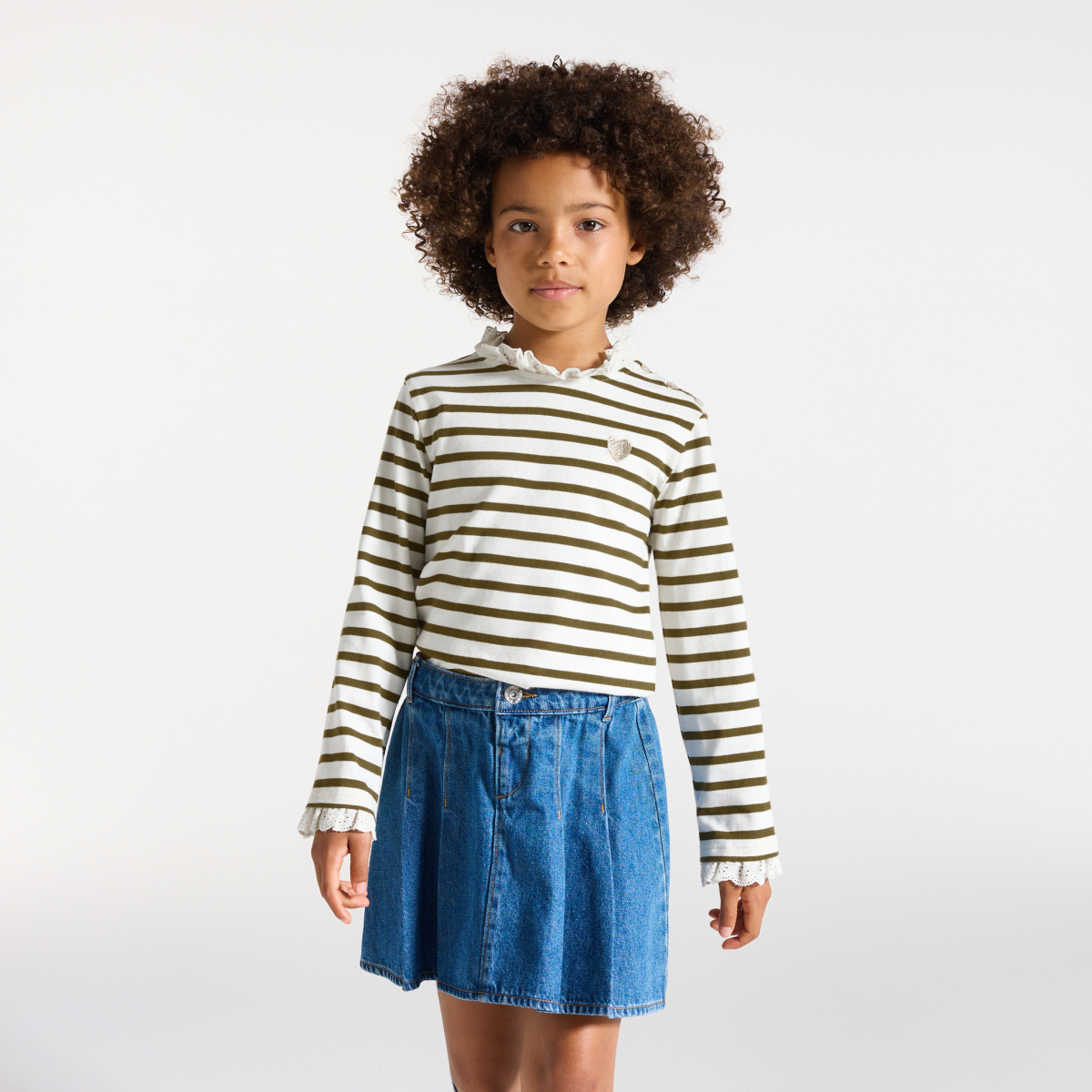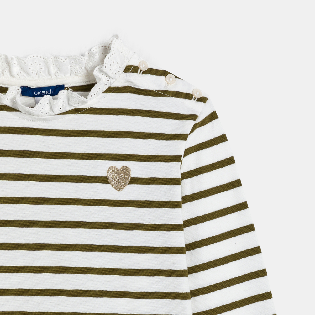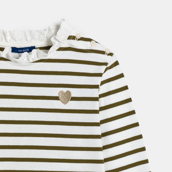 Description Des volants en broderie anglaise et un cœur brodé irisé sur la poitrine revisitent totalement l'esprit marinière de ce t-shirt rayé. Jersey de coton doux. Coupe droite. Col rond, ouverture boutonnée sur 1 épaule pour un enfilage facile. Manches longues.