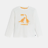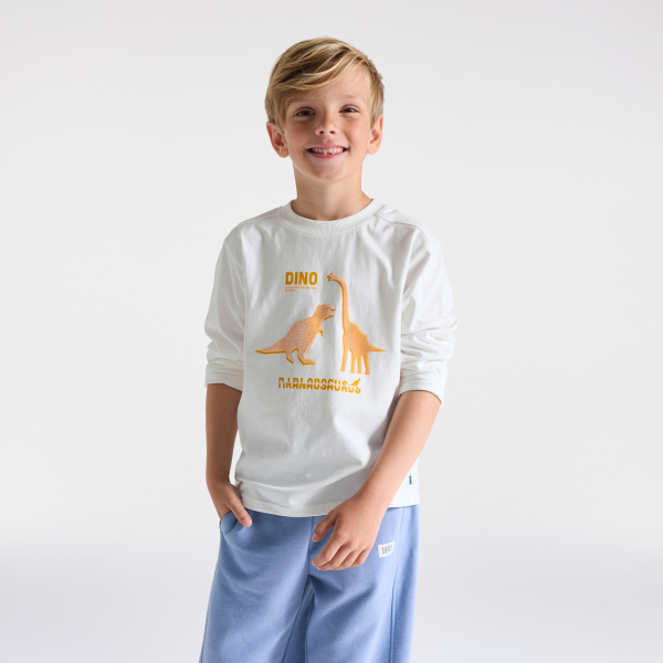 Impossible de résister à ce t-shirt blanc pour enfant, orné de motifs dinosaures captivants ! Confectionné en jersey doux et confortable, ce modèle à manches longues et à col rond est parfait pour le quotidien. Facile à enfiler, il offre une allure décontractée et stylée. Un indispensable pour les petits aventuriers !