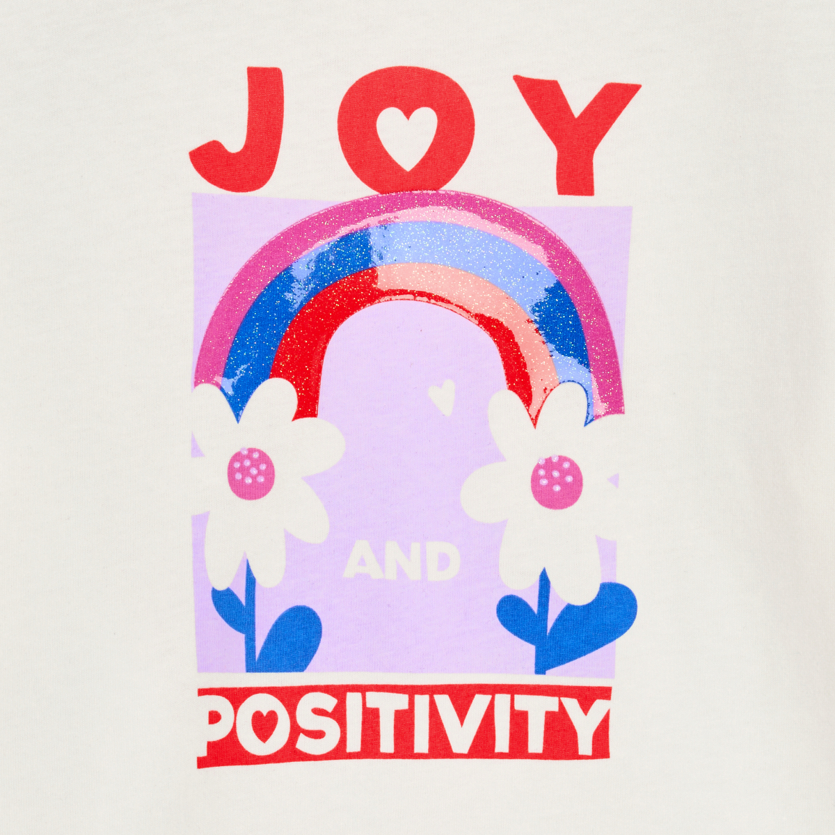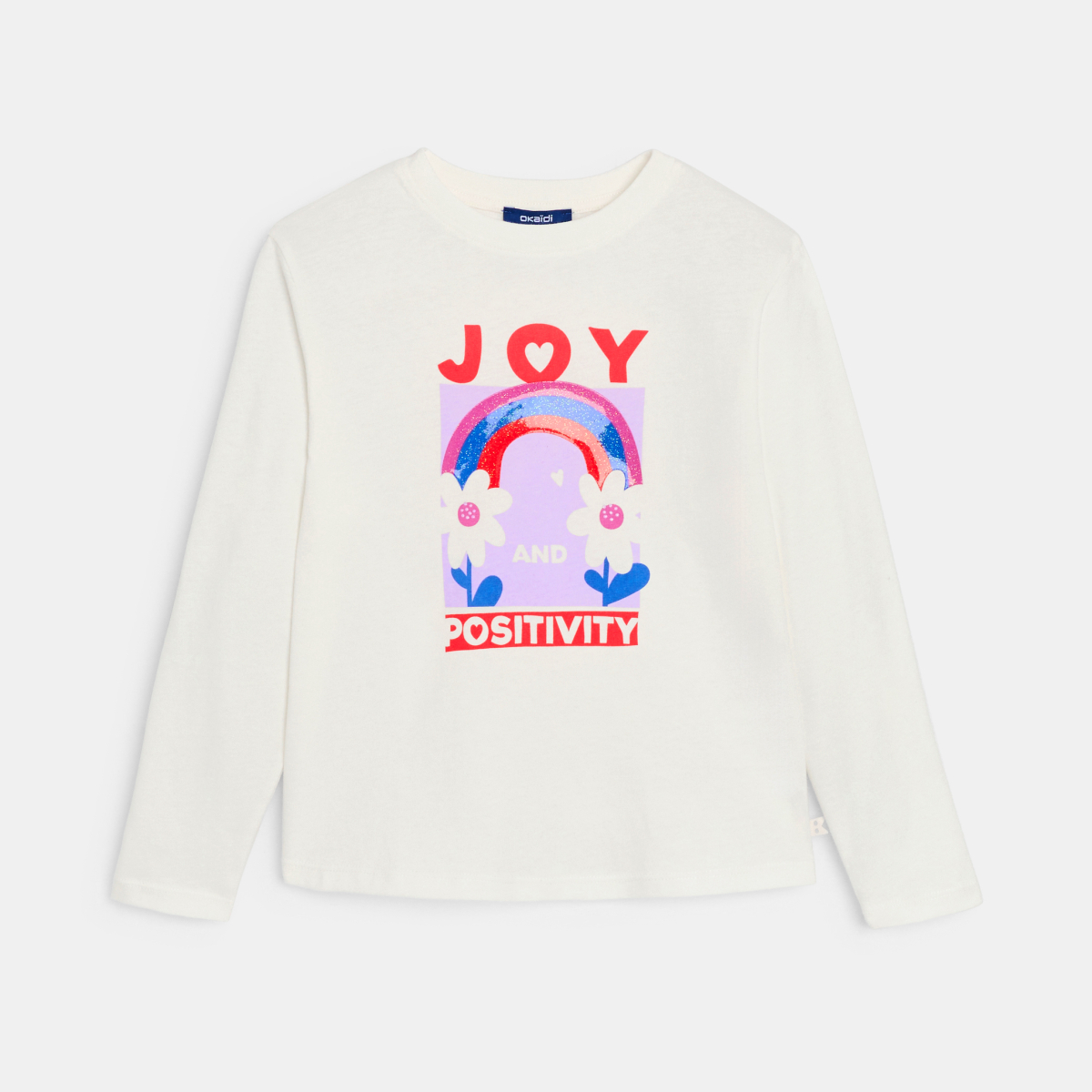 Les filles font le plein d'énergie positive et de paillettes avec ce t-shirt fantaisie ! Le jersey est doux, parfait pour passer une bonne journée à l'école ou s'amuser à une fête d'anniversaire. Coupe droite. Col rond. Manches longues. Base légèrement arrondie. Coutures ton sur ton.
