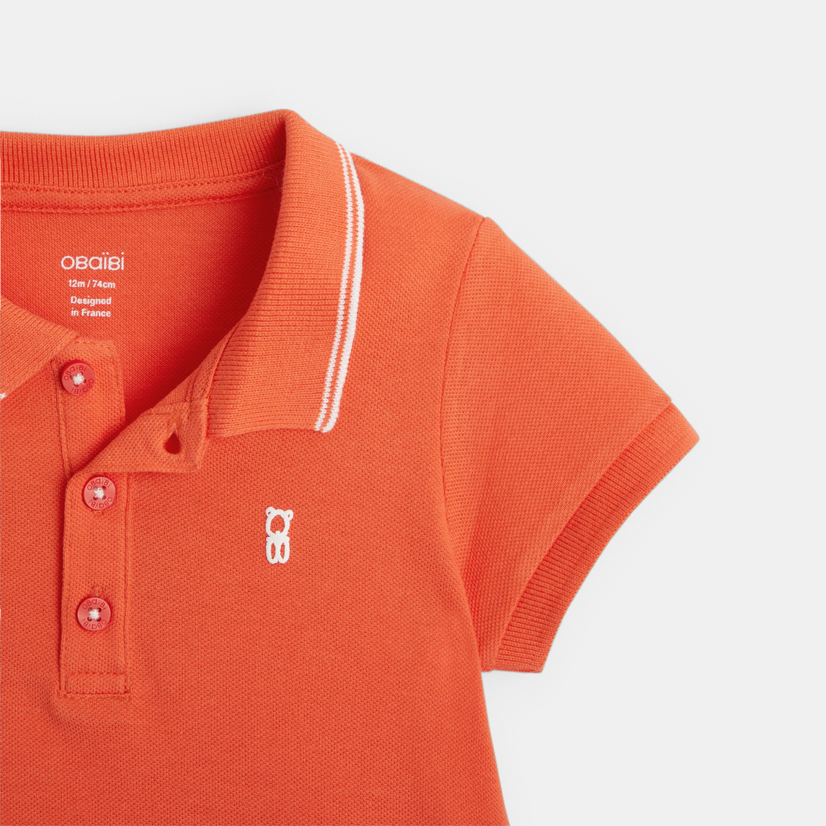 Polo manches courtes bébé garçon. Maille piquée pur coton. Col polo bord-côtes à fin liseré blanc, sur ouverture 3 boutons. Bas de manches en bord-côtes. Petit logo poitrine Obaïbi. Fentes côtés à la base.