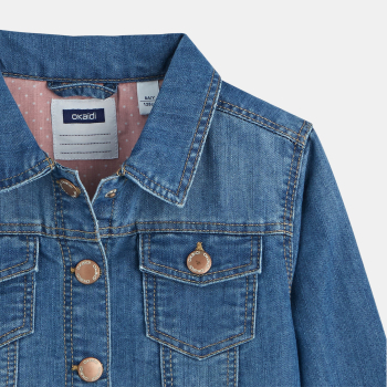 Description Veste / Blouson en jean fille. Denim doux et fin agréable à porter. Coupe droite et courte. Col à revers. Ouverture par pressions clou Okaïdi. 2 poches à rabat pressionné sur la poitrine. 2 poches cachées devant. Manches longues poignets pressionnés intérieur contrasté. Base droite. Jacron Okaïdi dos. Finition surpiquée. Etiquette d'identité et accroche portemanteau.